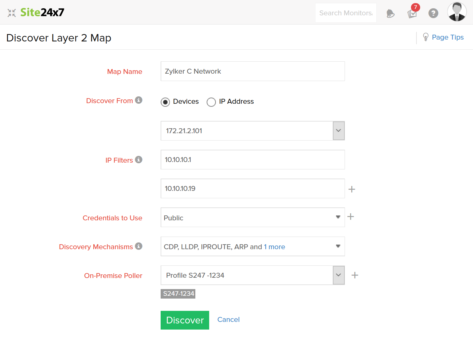 - 发现自:如果您希望使用已被监控的网络设备发现和创建网络映射,请选择设备。从下拉列表中选择一个。如果该设备尚未被 Site24x7 监控,请选择 IP 地址,然后在下面出现的框中输入您要发现和映射的设备的 IP 地址。