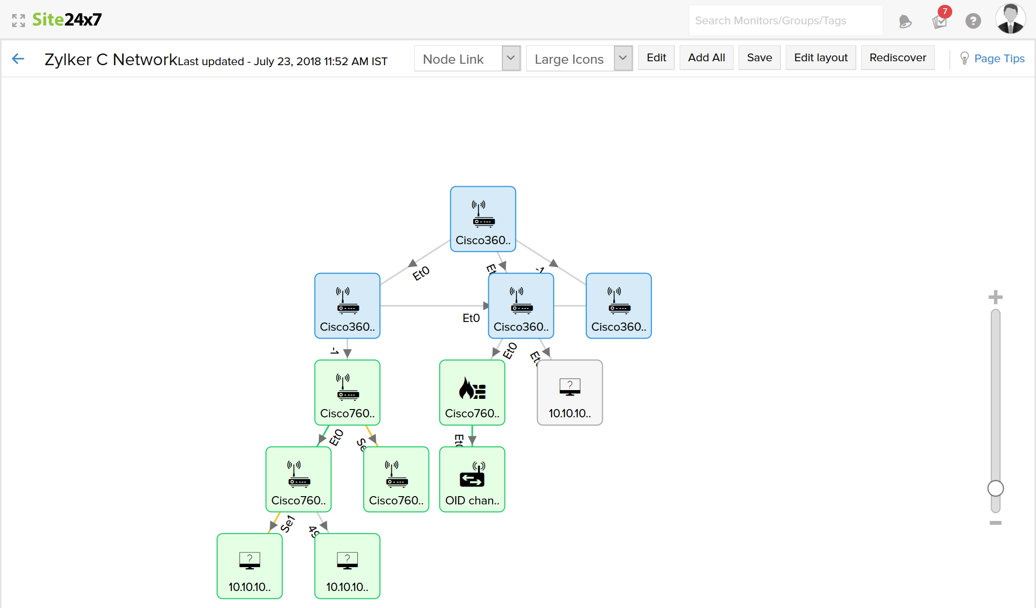 单击编辑布局以编辑地图的布局并调整链接之间的间距。您可以编辑径向树和节点链接结构的布局。基本上,这两种结构都为您提供相同的设备互连映射。它们仅在审美观点上有所不同。径向树看起来像一棵以种子节点为中心的树。而在节点链接结构中,链接是按级别排列的。
