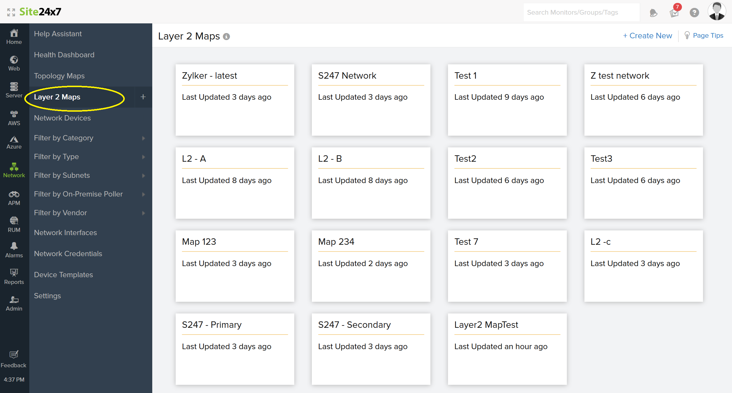 登录到Site24x7,单击左侧面板上的网络,然后选择二层映射。