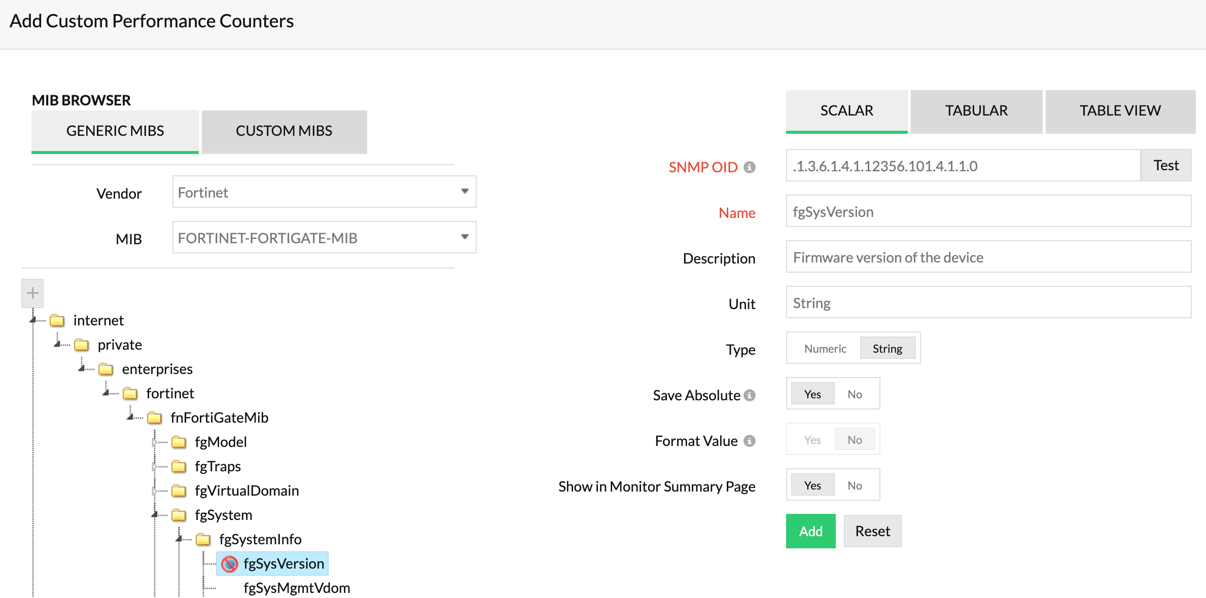 - 标量性能计数器: 通过输入 SNMP OID、名称、描述、单位、类型和格式值的值来添加标量性能计数器。您可以手动输入它们,也可以使用内置的 MIB 浏览器来执行相同操作。