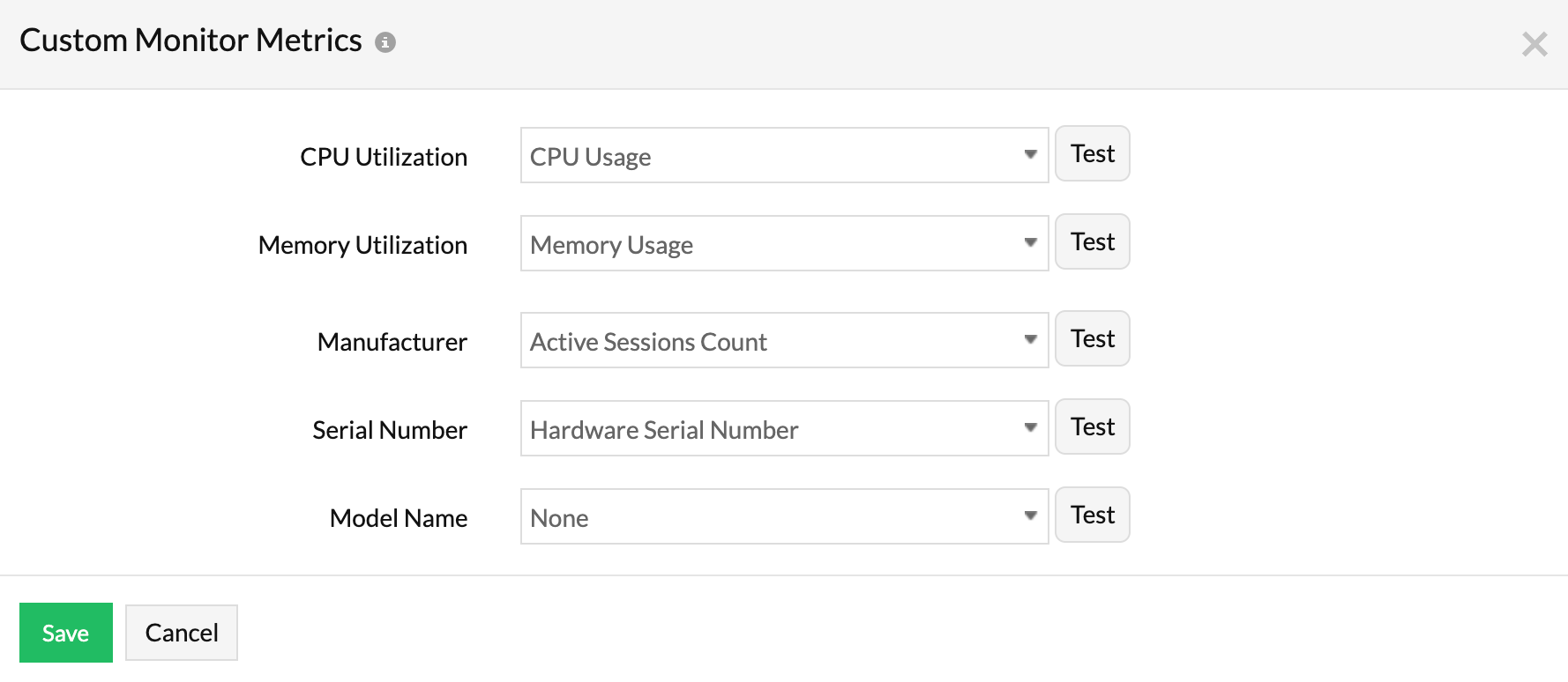 - 自定义监控指标:您可以通过提供自定义性能计数器来为您的设备类型配置监控级别指标。单击配置自定义监视器指标。在 弹出的Custom Monitor Metrics 窗口中,从下拉菜单中选择CPU Utilization、Memory Utilization、Manufacturer、Serial Number和Model Name性能计数器的自定义指标。您也可以在添加之前对其进行测试。