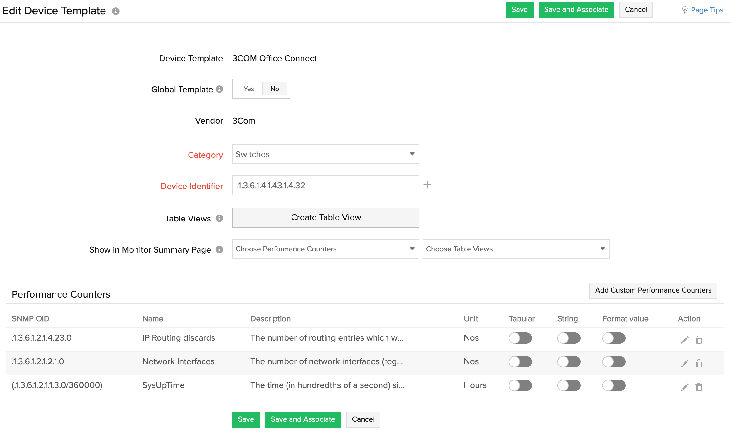 - 保存您的更改。如果您希望将此包含新性能计数器的设备模板关联到一组网络设备,请单击保存并关联。