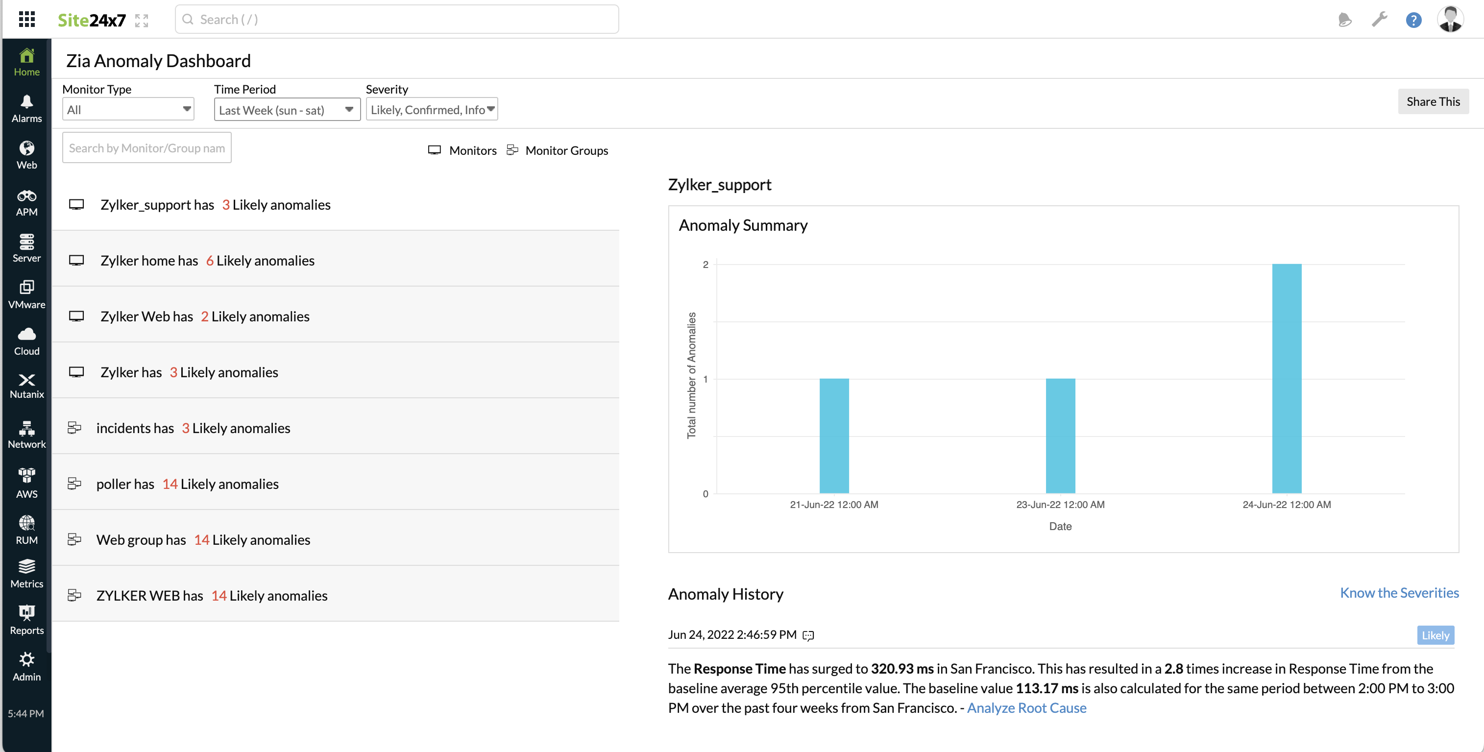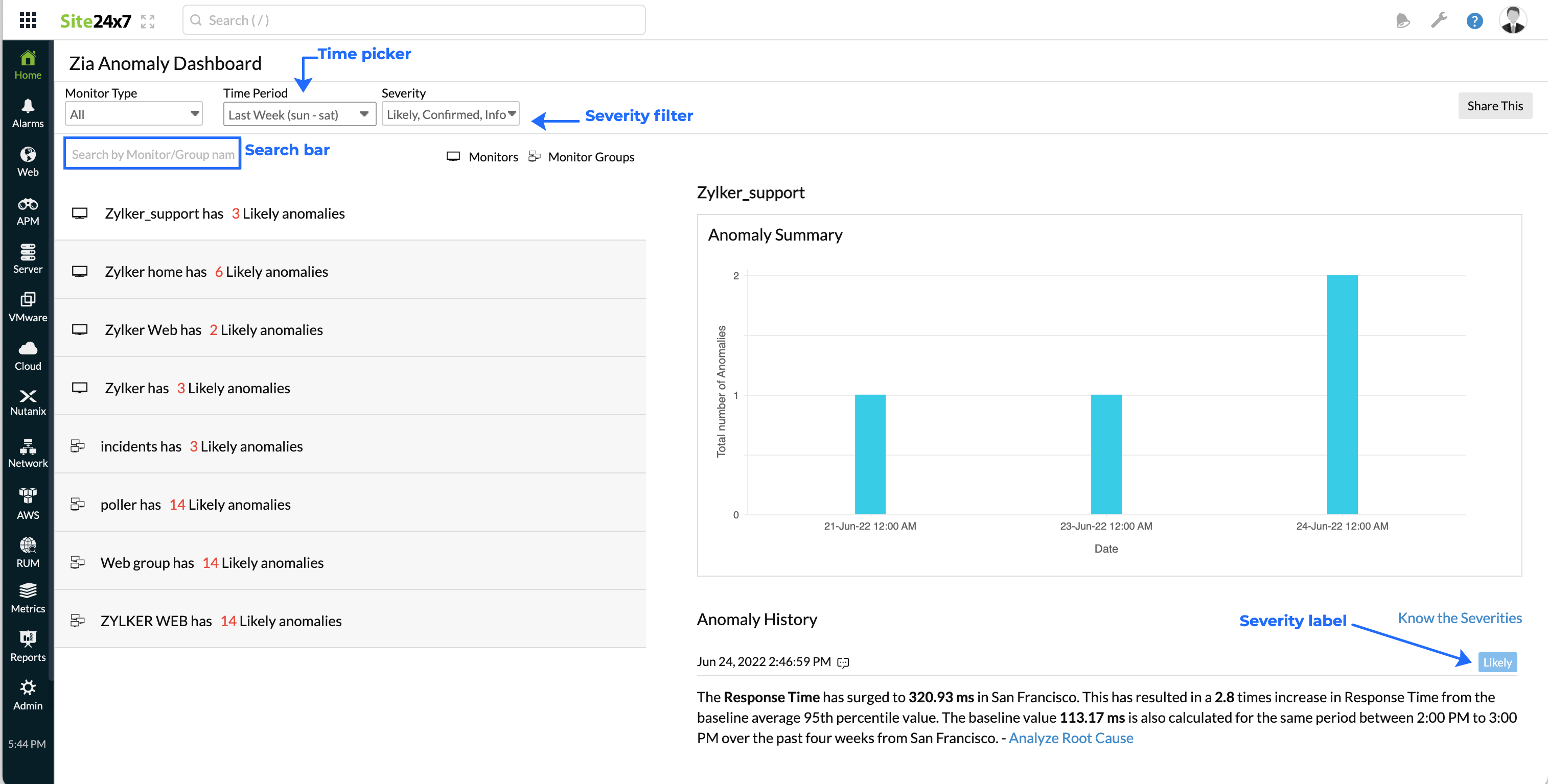 异常仪表板可让您事先轻松解码 IT 基础架构中的任何负面趋势。您可以根据监视器或监视器组选择来查找和过滤异常。