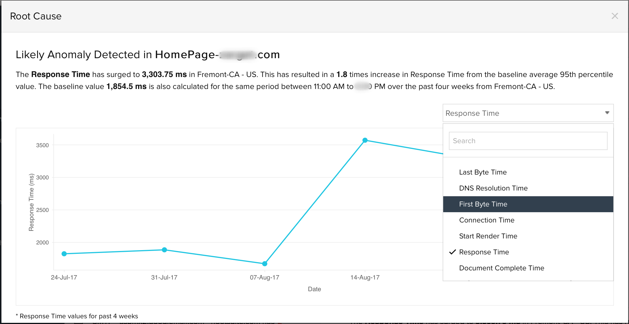 单击特定异常消息的“了解根本原因”链接后,系统会提示您一个模态弹出窗口,您可以在其中发现带有指标值的折线图。只需将鼠标悬停在折线图上即可查看特定日期和时间的实际指标值。默认指标值可能因监视器而异。每个监视器都有一个或多个默认属性,异常检测将被启用。但是,除此之外,您还可以使用折线图上方的下拉菜单,在同一时间范围内查看所选监视器的其他性能属性。