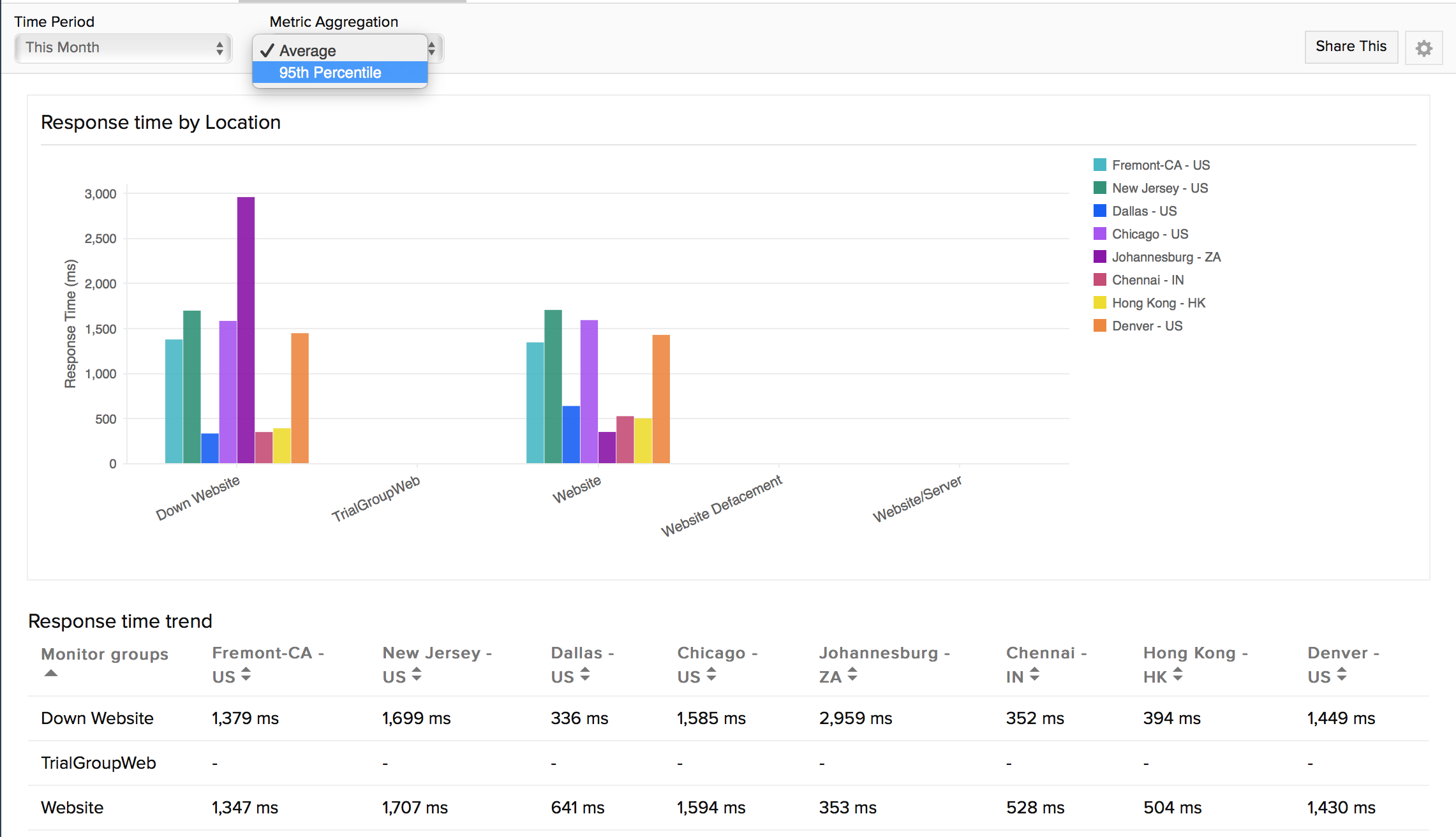 此视图可让您清楚地比较和了解您选择的位置的各种监视器或监视器组的可用性趋势(百分比) 。您可以从时间段下拉列表中选择相关时间段,然后选择可用性数据的 平均值或 95%值 的指标聚合来执行趋势分析。可以单独为监视器组选择指标聚合器。如果您选择了监视器,数据将默认显示平均值。您可以使用两种不同的视图: