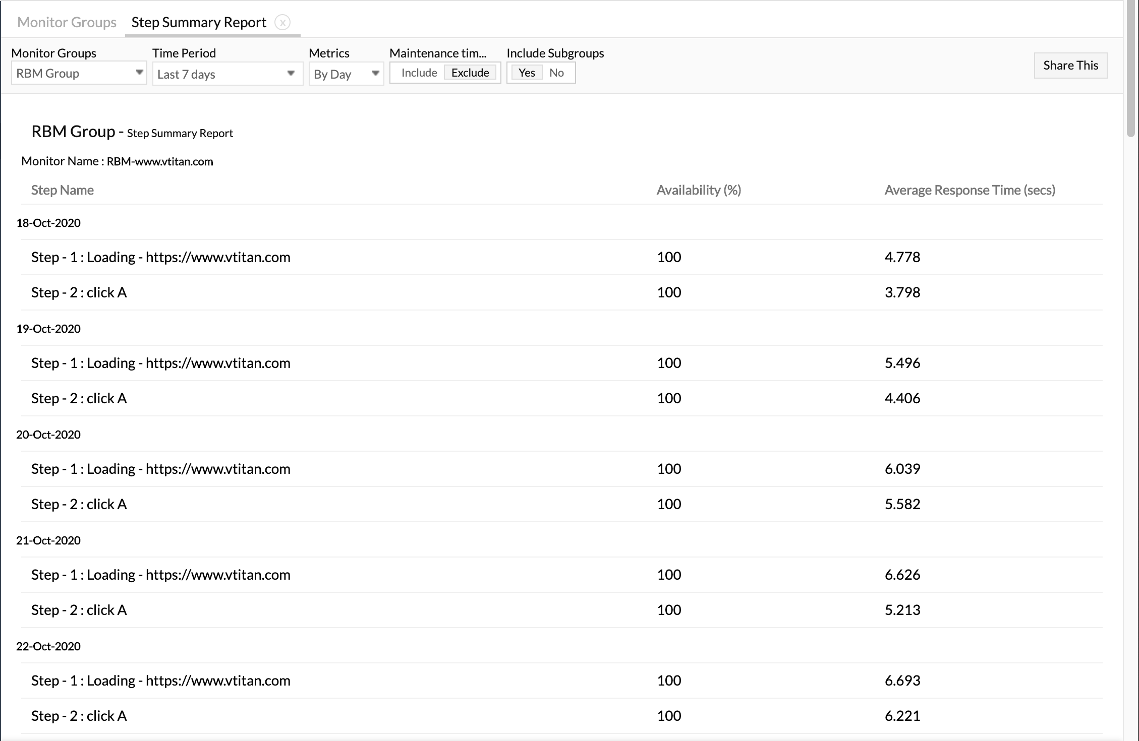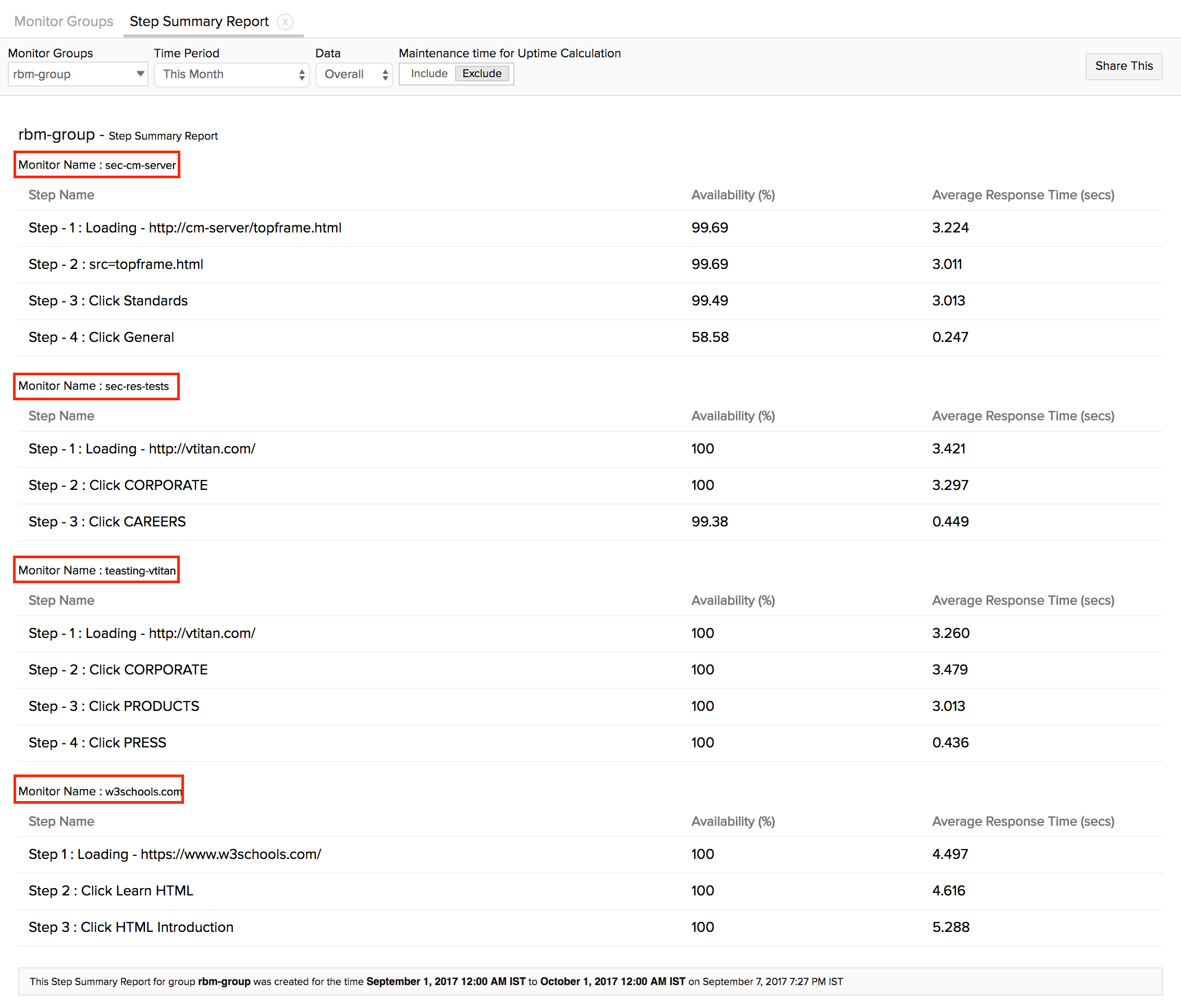 - 从标题下拉列表中选择所需的监视器组并更改列出的参数以查看您的步骤汇总报表。