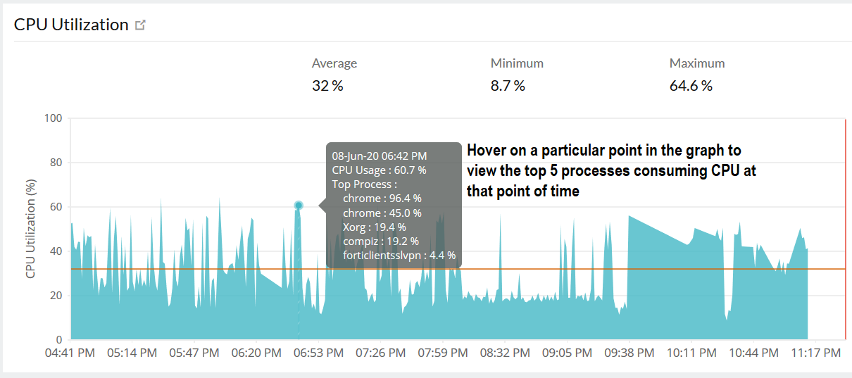 此外,通过将鼠标悬停在CPU 利用率图中的特定点上,查看特定时间点消耗 CPU 的前五个进程。顶部进程数据是使用 WMI 查询“ Win32_PerfFormattedData_PerfProc_Process”计算的。