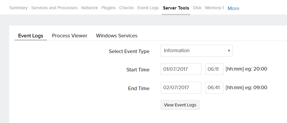 您可以根据特定时间段的事件类型(全部、错误、信息、警告)查看事件日志。选择时间段的格式为 DD/MM/YYYY | 哈:嗯。