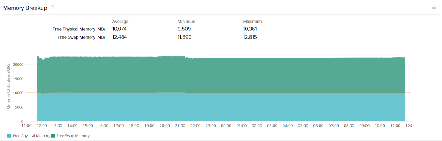 | 磁盘分区详细信息和使用情况预测 | 已用和可用磁盘空间的表格视图(以 MB 和百分比为单位)。单击这些值可转到每个分区的详细性能报表。单击操作下的铅笔图标为每个分区设置阈值。您还可以使用铅笔图标选择跳过任何分区的告警。 |