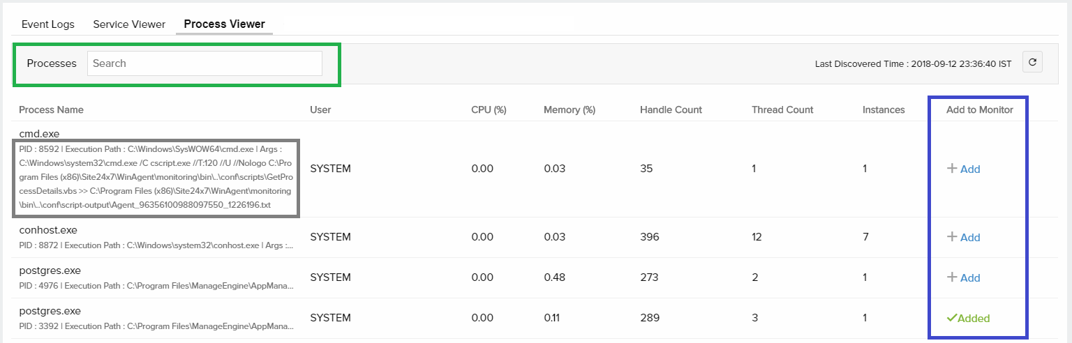 获取服务器上运行的服务和进程的完整列表,包括它们的 CPU (%)、内存 (%) 使用率、句柄数、线程数和实例。您可以在顶部的搜索栏中搜索任何特定进程(在下面的屏幕截图中以绿色突出显示)并使用+添加选项添加该进程以进行监控(在下面的屏幕截图中以蓝色突出显示)。单击进程名称以获取其 PID、执行路径和传递的参数(在下面的屏幕截图中以灰色突出显示)。