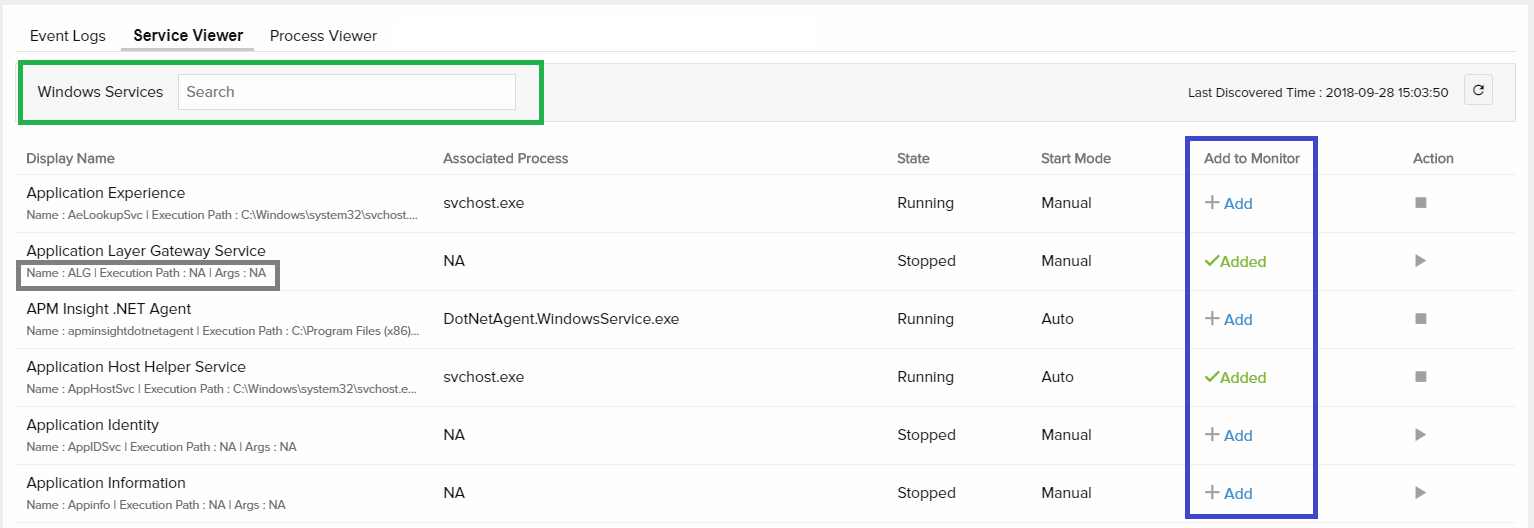 获取服务器上运行的服务及其相关进程、当前状态(停止或运行)和启动模式(手动或自动)的完整列表。您可以在顶部的搜索栏中搜索服务(在下面的屏幕截图中以绿色突出显示),使用+Ad