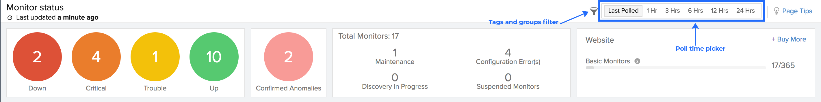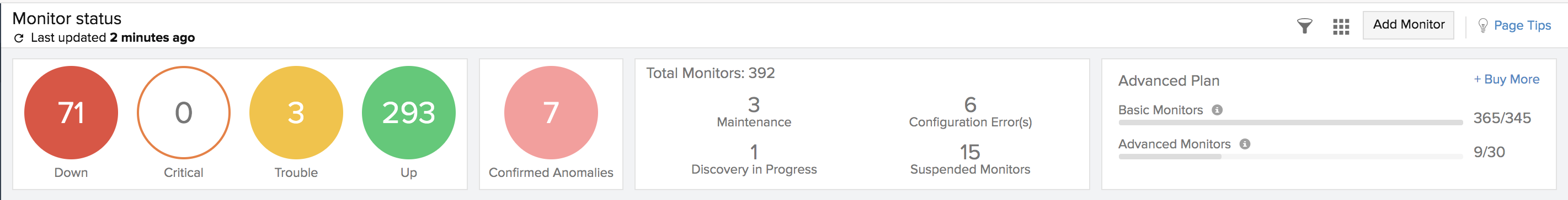 现在,所有监视器都将根据其当前的运行状态和状态智能地分类为不同的部分,就在您的主屏幕上,让您更好地了解监视器的性能。向下监视器以红色分组。危急监视器以橙色显示。故障监视器在黄色下分组。正在维护的监视器被分组为紫色。所有可用的监视器都显示为绿色。它还展示了每个此类别的监视器计数。您还可以查看帐户中剩余的操作监视器和告警信用的数量。通过单击“+购买更多”按钮,您可以购买额外的监视器和告警点数。此外,此报表中还列出了每个已配置监视器的响应时间(以毫秒为单位)及其上次轮询时间。