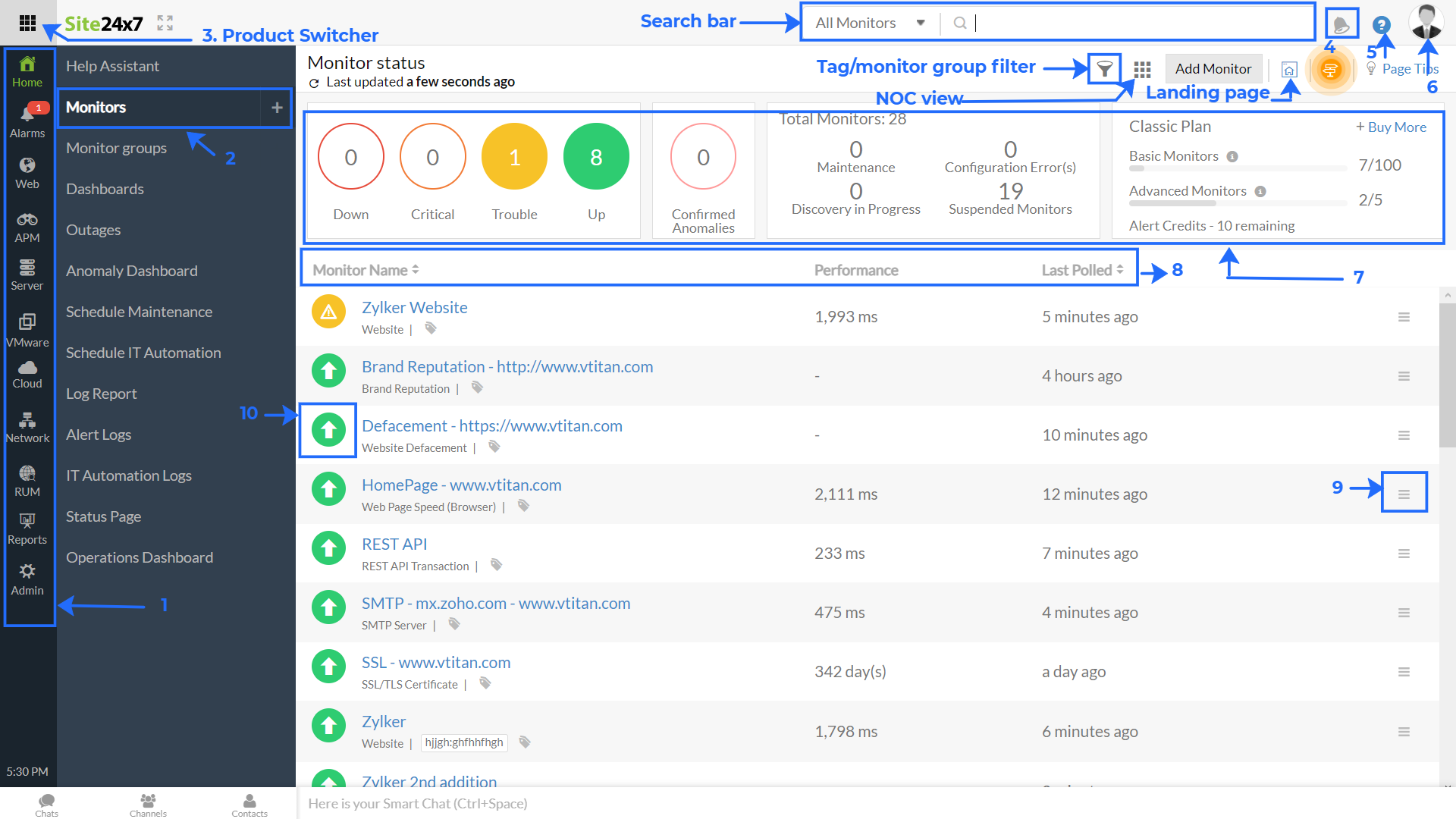 Site24x7 客户端控制面板 - 1(图例 1 至 13)