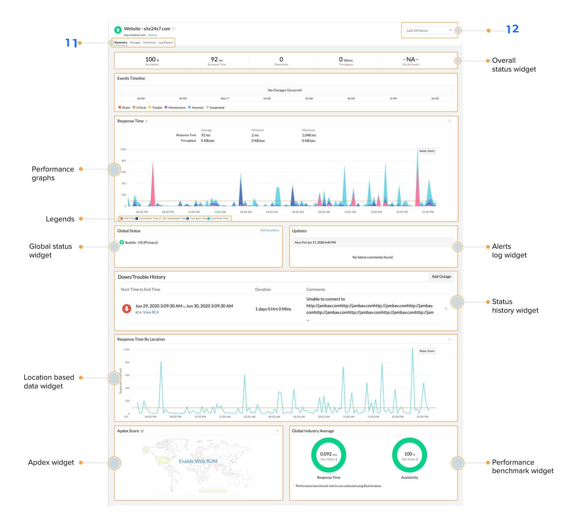 | 整体状态小窗件 | 立即查看已配置监视器的整体状态。它包括可用性、响应时间、停机时间和持续时间、吞吐量、达到的 SLA 百分比和 RCA 详细信息等指标。 |