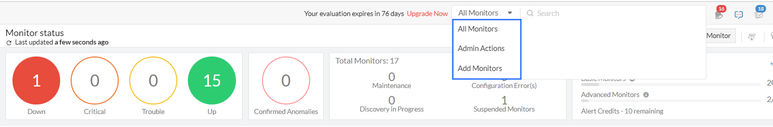 搜索提供了三个选项,用于过滤已添加到您帐户中的监视器、监视器组或接口、管理员操作,以及用于在您的帐户中添加新监视器。
