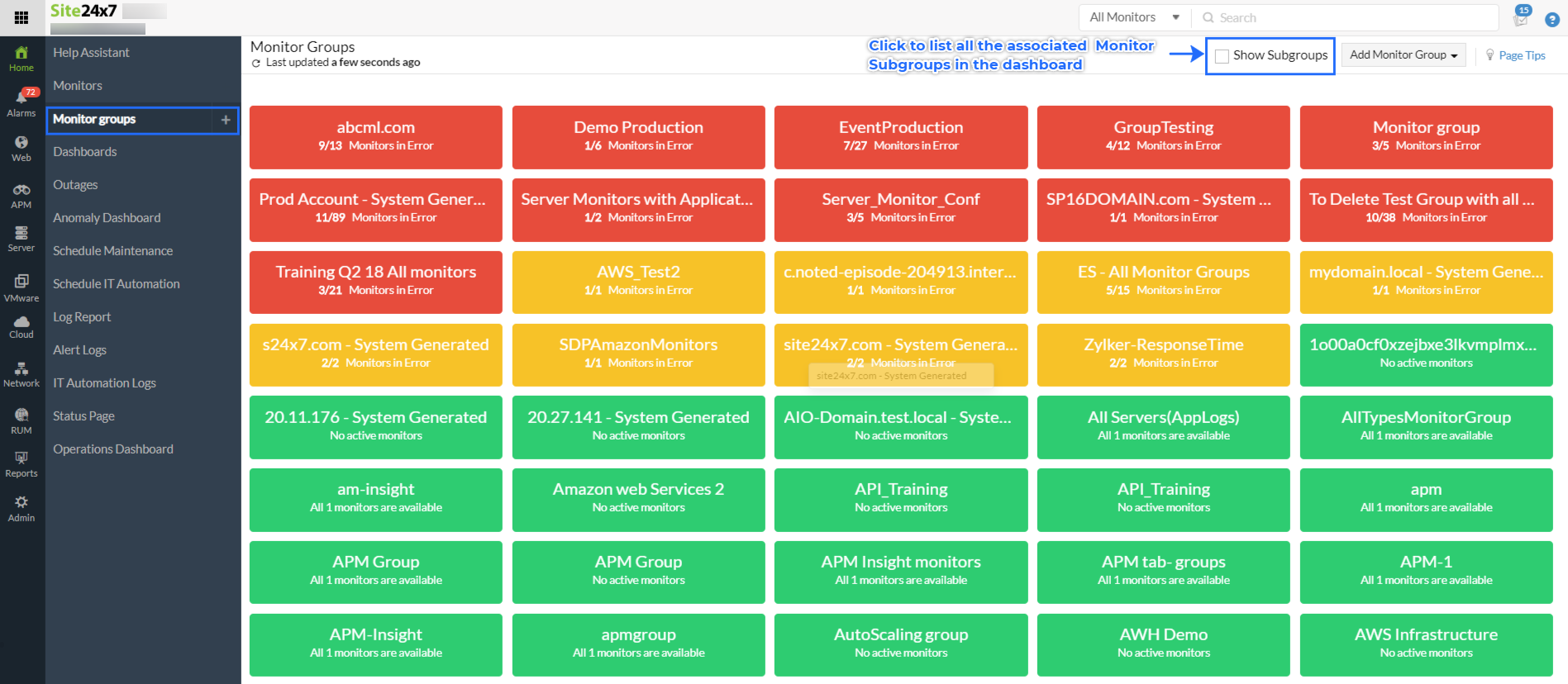 基于您的监视器组及其子组构造,内置的业务视图让您可以概览各种时间范围内的基础架构性能和单个监视器的可用性。它可以帮助您快速隔离各个组和子组中的性能异常值。