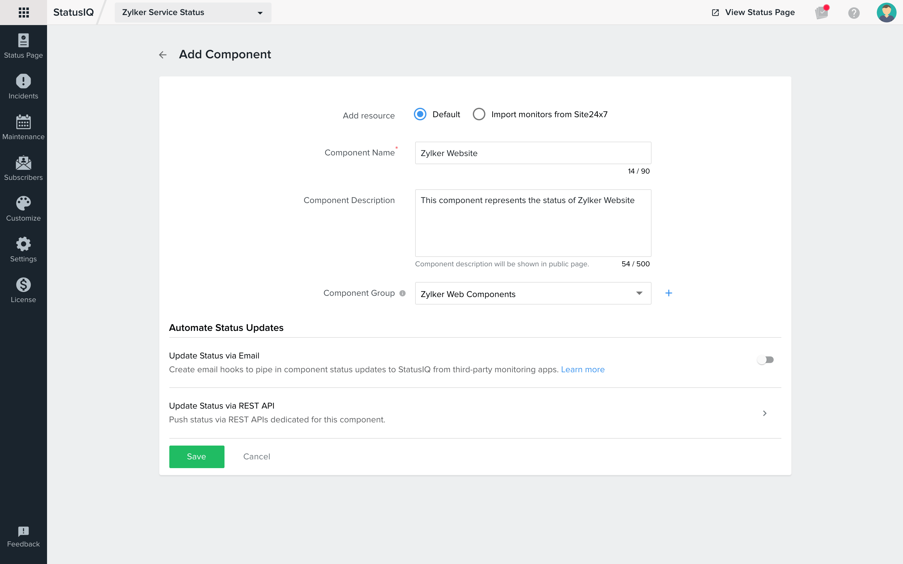 - 自动状态更新:如果您想通过任何其他监控工具或任何内部监控工具更改状态,您可以手动更改组件的状态以及启用自动状态更新选项。了解有关自动化的更多信息。