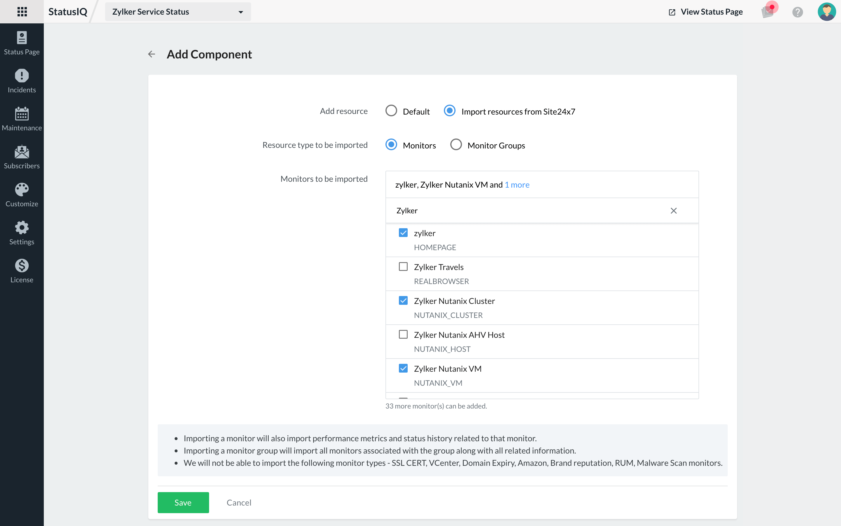 导入监视器功能可以帮助您将监视器作为组件从 Site24x7 批量导入到 StatusIQ。这有助于减少在 StatusIQ 中创建多个组件并将它们关联到 Site24x7 资源所花费的时间。从 Site24x7 导入监视器:
