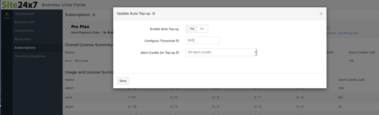 - 配置阈值:提供阈值限制以在您的信用低于此限制时自动为您的告警信用充值。