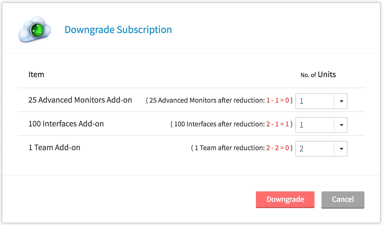 - 验证您的加载项计数并单击降级以 降级您的监控加载项。
