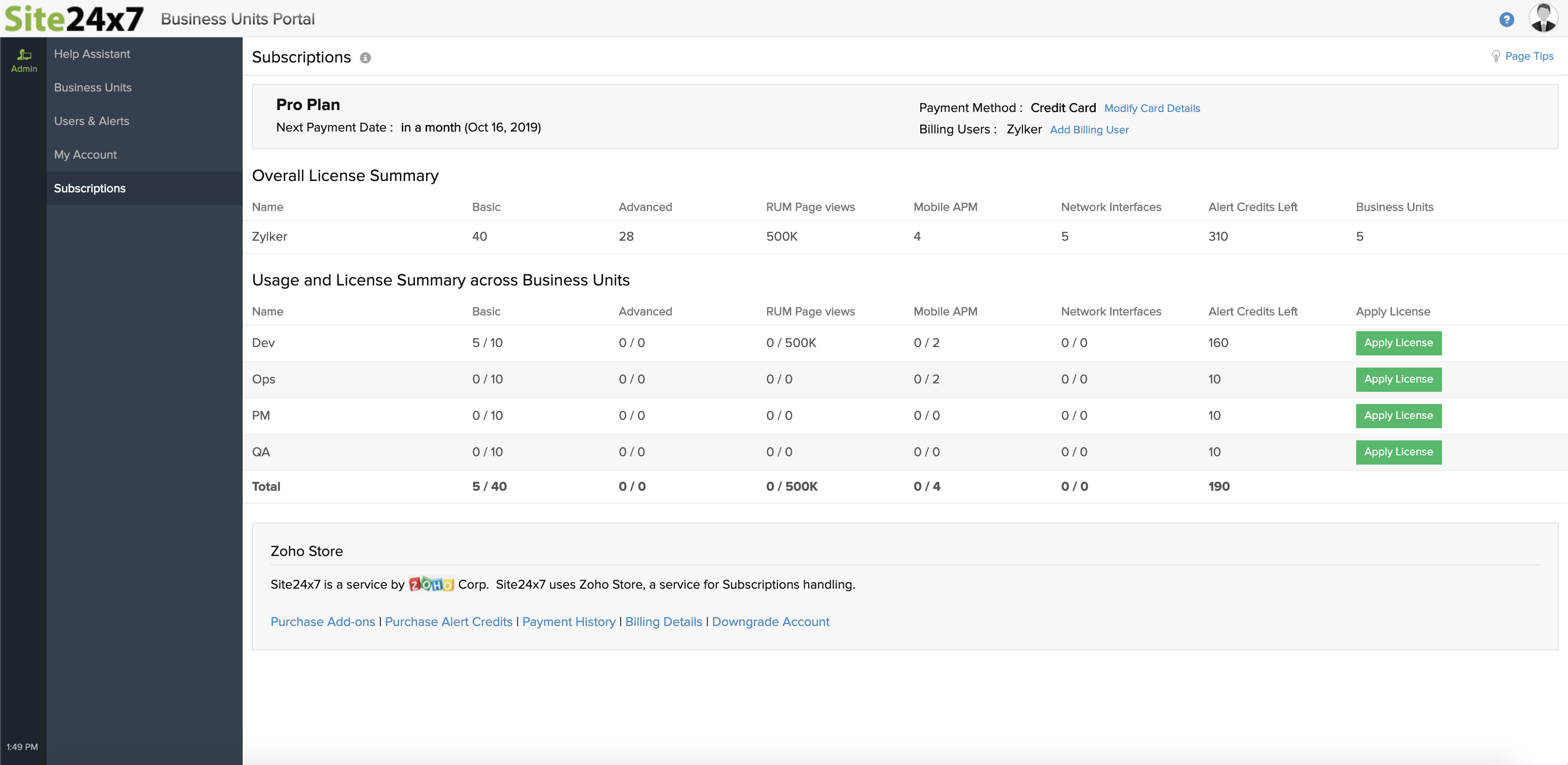 您可以在统一的仪表板中查看您的 Site24x7 业务单位许可和使用情况摘要。
