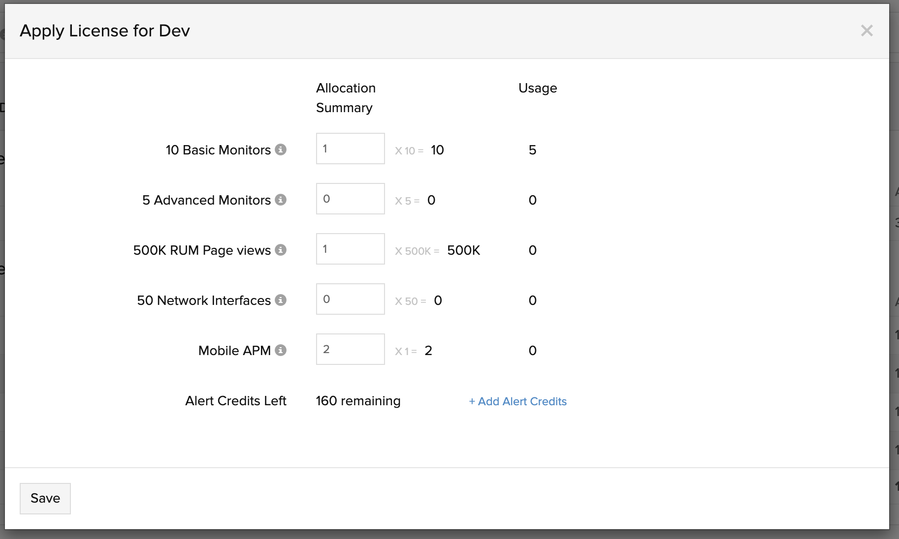 业务单位门户管理员可以访问“应用许可”按钮以将基本监视器、高级监视器、RUM 页面视图、网络接口、AppLogs 和告警信用分配给各个业务单位。