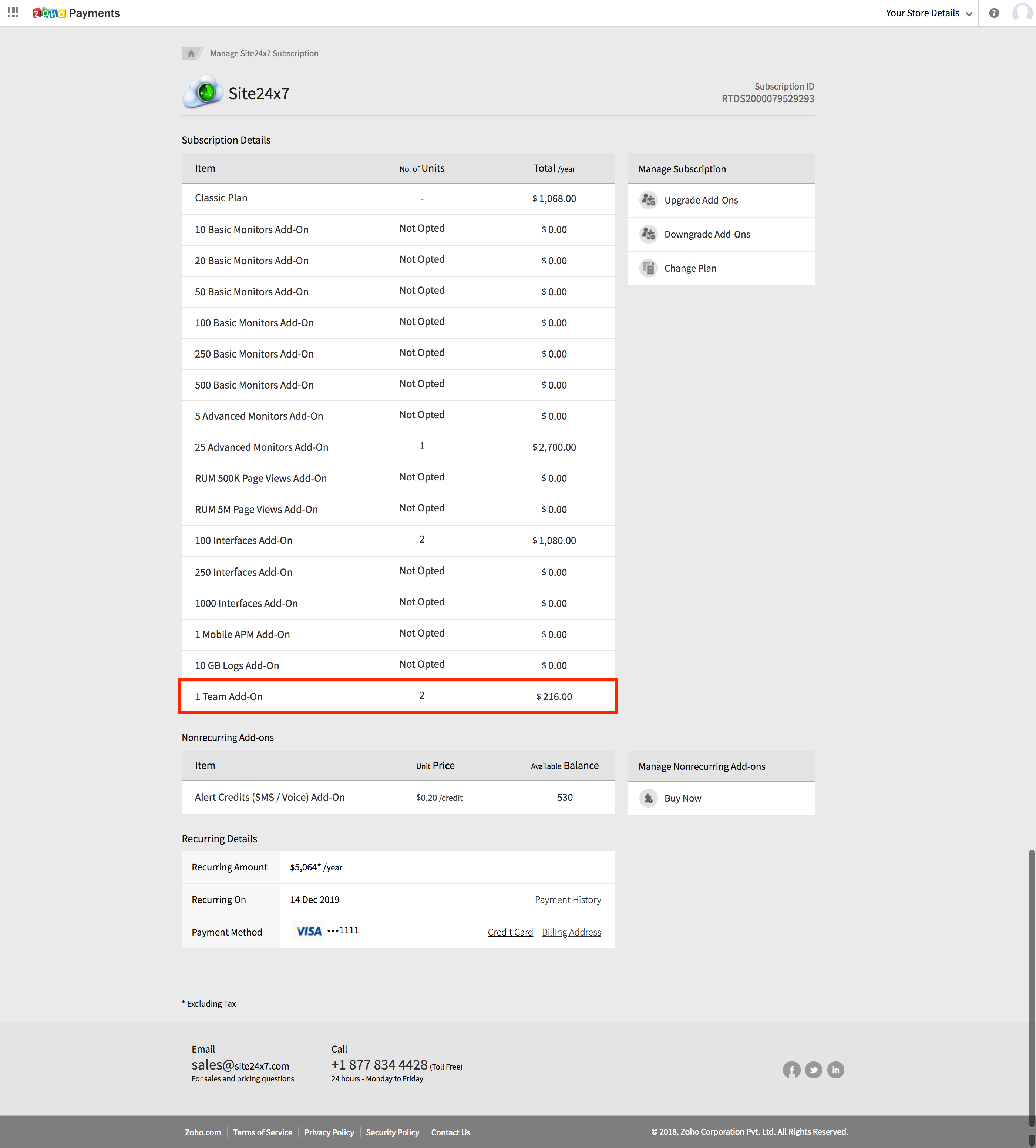 - 您将被导航到管理 Site24x7 订阅屏幕。在这里,单击管理非定期选件下列出的立即购买。