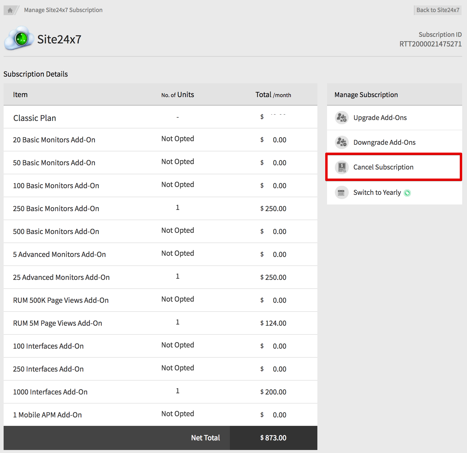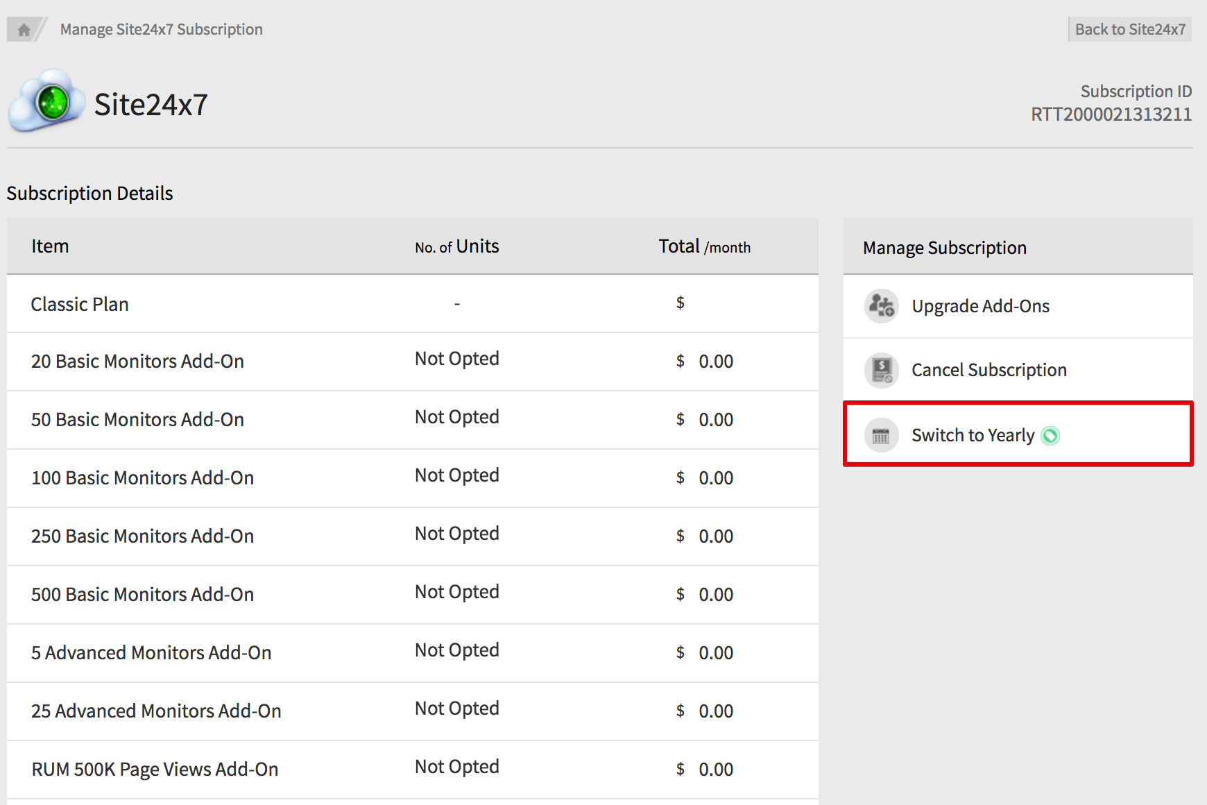 这会将您导航到“管理 Site24x7 订阅” 窗口。在这里您可以升级/降级您的插件。