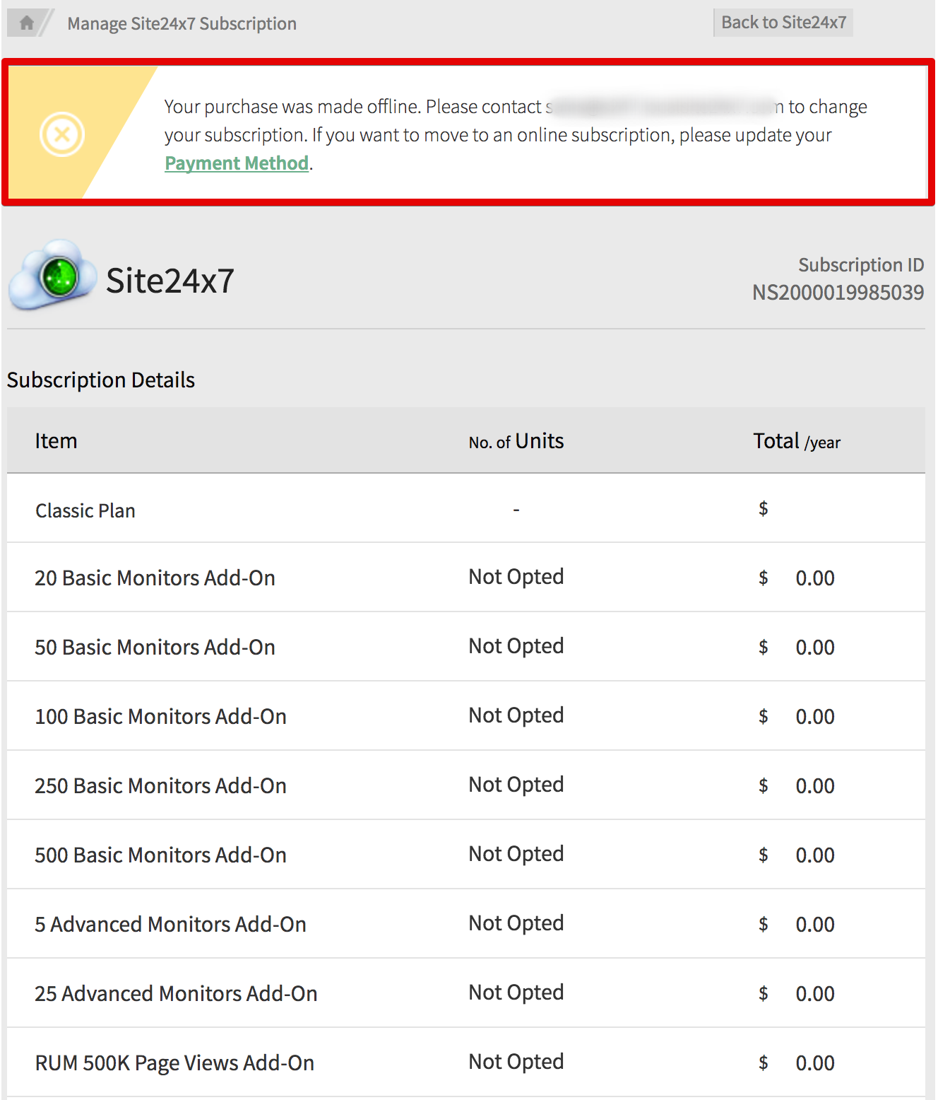 您将被导航到“管理 Site24x7 订阅”页面,在该页面中会向您提供一条通知消息以转换为在线订阅模式。