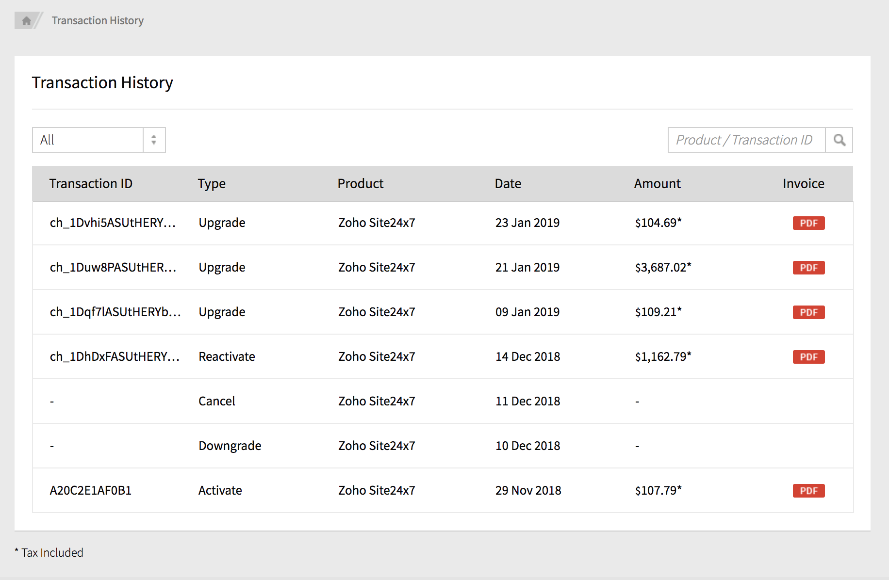 - 单击 Zoho Stores 下列出的付款历史记录 。