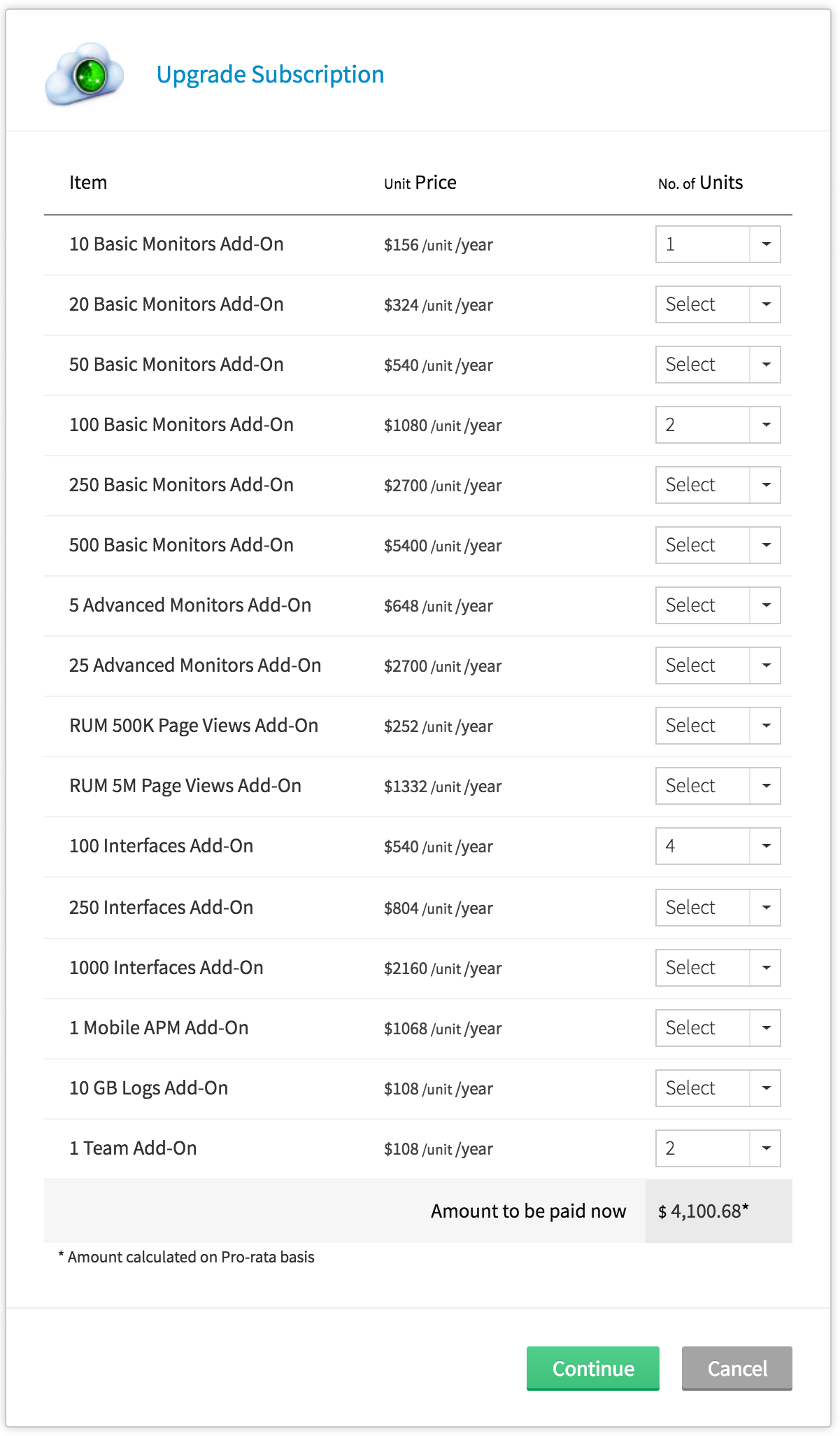 附加选件是监视器的“迷你包”,可以增加您现有的订阅。此外,它们使您可以灵活地添加/减少监视器。您可以根据您选择的计划购买任意数量的附加附加选件。您可以购买基本监视器、高级监视器、RUM 页面视图、AppLogs 和网络接口作为附加包。