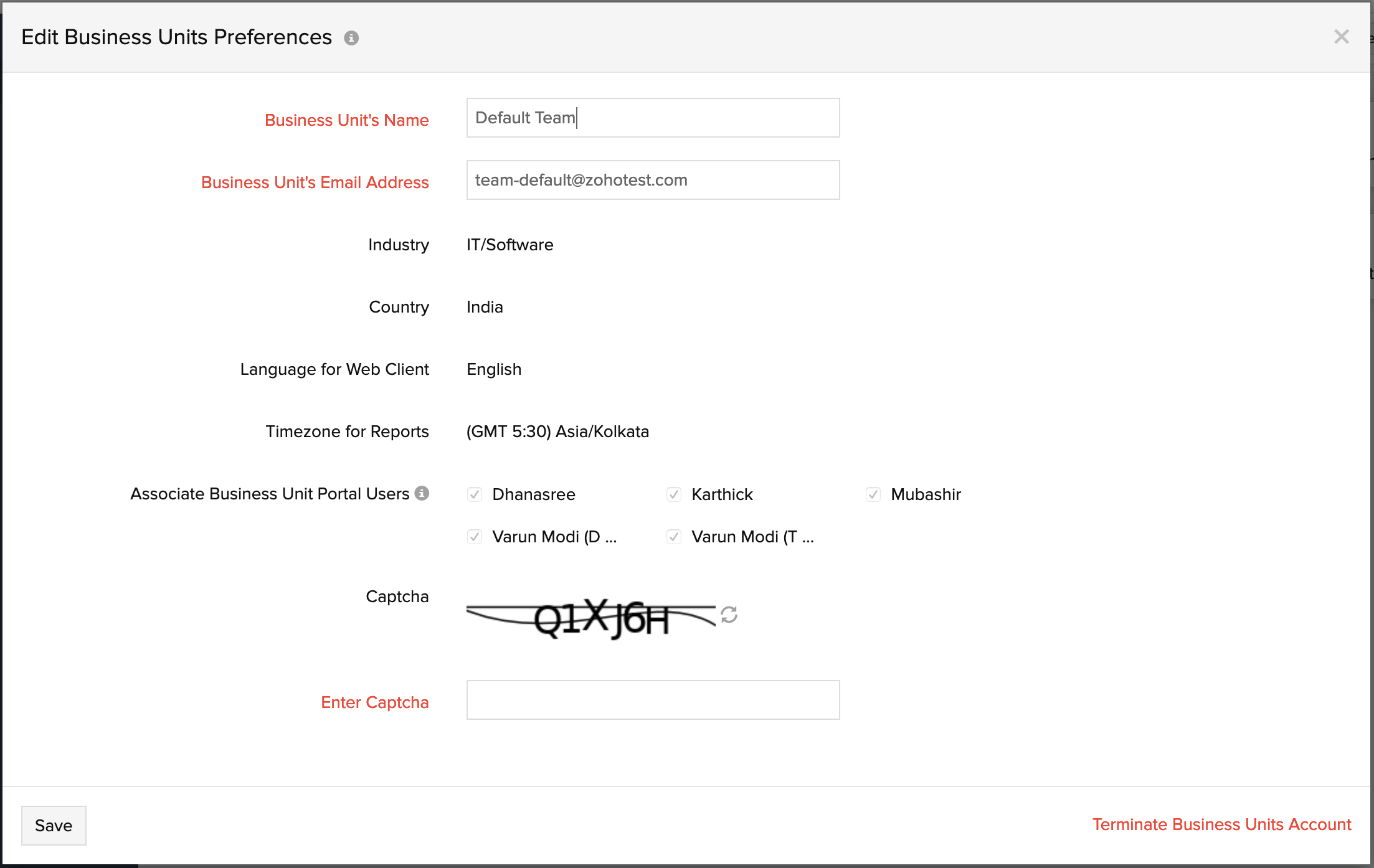 - 更新 业务部门视图中的值并单击保存以修改业务部门首选项。