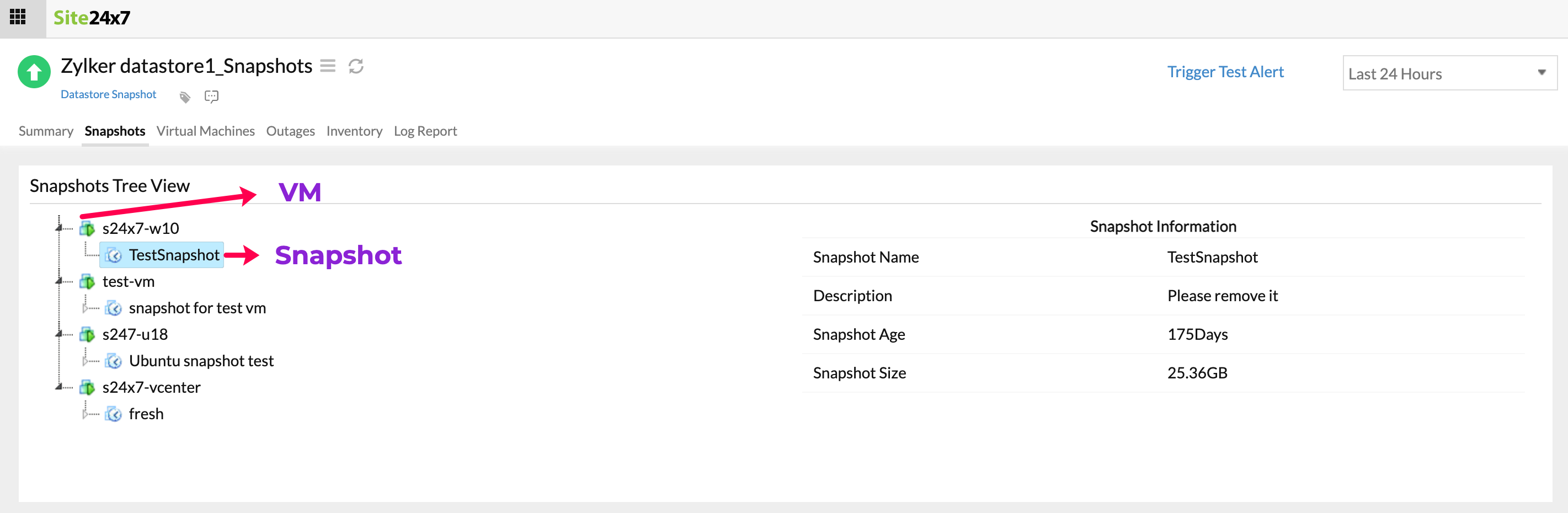 要查看快照监视器的性能指标,请登录您的Site24x7 帐户,导航到VMware> Datastore Snapshot,然后单击快照名称。