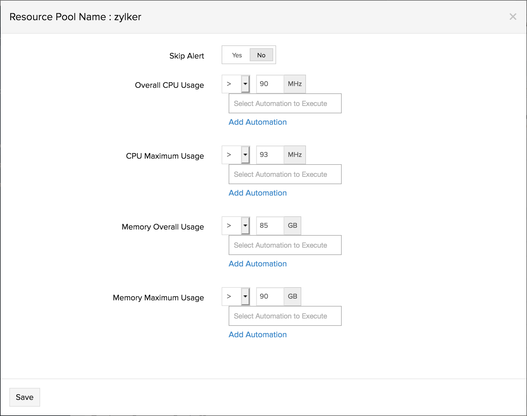 - 最大内存使用量:以 MB 为单位设置一个值。当内部资源池的最大或上限内存使用量超过该设置值时,您将收到通知。 8.单击保存。